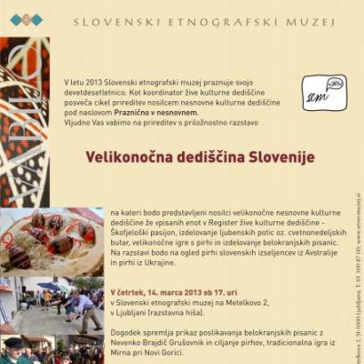 On Thursday 14 March 2013, the Slovene Ethnographic Museum saw the opening of the exhibition “Slovenia’s Easter Heritage” curated by Dr. Nena Židov. The exhibition, which was on show until 7 April 2013, included units of intangible cultural heritage entered in the Register of Living Cultural Heritage and their carriers.