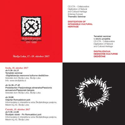 V okviru mednarodnega srečanja projekta CD-ETA (Interreg Europe) vas vljudno vabimo na tematski seminar »Digitalizacija nesnovne kulturne dediščine«, ki bo v sredo, 18. oktobra 2017, z začetkom ob 9.30 v Sokolskem domu (Mestni trg 16-17) v Škofji Loki. VABILO PROGRAM SEMINARJA
