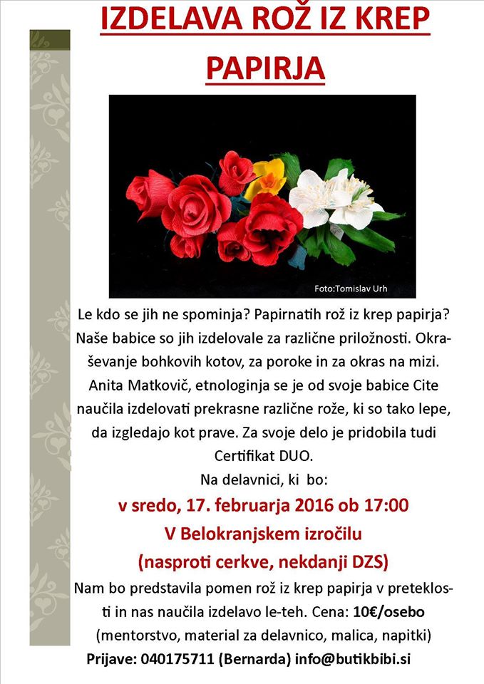 V sredo, 17. februarja 2016 bo ob 17:00 v Belokranjskem izročilu, Ulica Staneta Rozmana 6 v Črnomlju, delavnica izdelave rož iz krep papirja, ki ga bo vodila etnologinja Anita Matkovič. Kotizacija 10 € ( material in prigrizek ter napitki med delavnico). Obvezne prijave na telefon 040175711 (Bernarda) oziroma na naslov info@butikbibi.si.