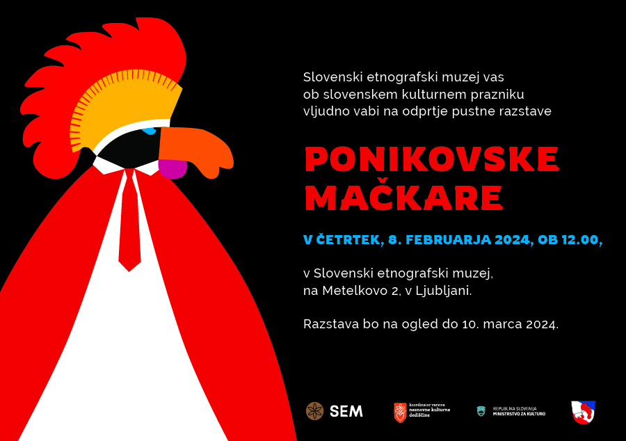 Kulturni praznik (8. februar 2024) bo v Slovenskem etnografskem muzeju že šesto leto zapored pustno obarvan, saj muzej na ogled postavlja razstavo pustnih likov – letos bodo predstavljene Ponikovske mačkare.