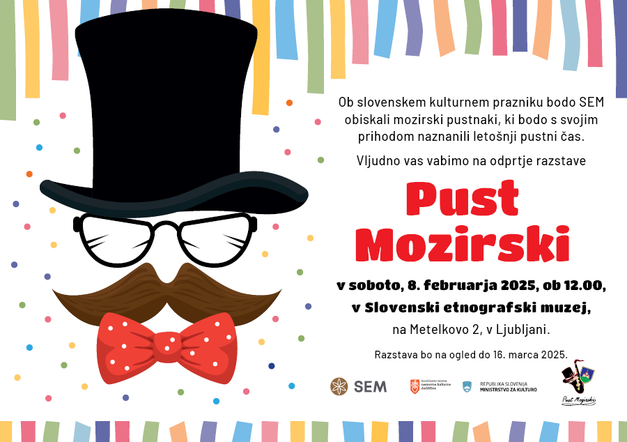 Breadcrumb Naslovnica Odprtje razstave Pust Mozirski, SEM, ... Odprtje razstave Pust Mozirski, SEM, 8. 2. 2025 V soboto 8. februarja 2025 ob 12. uri lepo vabljeni v Slovenski etnografski muzej na odprtje manjše občasne razstave Pust Mozirski. Razstava bo na ogled do 16. marca 2025. kdaj08.02.2025 ob 00:00 sl:Dogodki:Odprtje razstave Pust Mozirski, SEM, 8. 2. 2025 [edit]