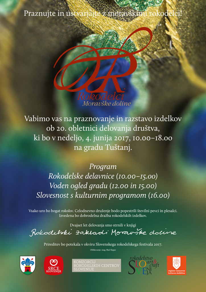 Društvo rokodelcev – Rokodelski center Moravče vabi na praznovanje in razstavo izdelkov ob 20. obletnici delovanja društva, ki bo v nedeljo 4. junija 2017 med 10. in 18. uri na gradu Tuštanj.