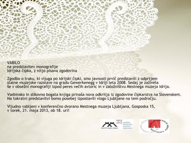 21.5.2013 ob 18. uri bo v konferenčni dvorani Mestnega muzeja Ljubljana predstavitev monografije »Idrijska čipka, z nitjo pisana zgodovina«. Na predstavitvi bo orisana vloga Ljubljane na tem področju.