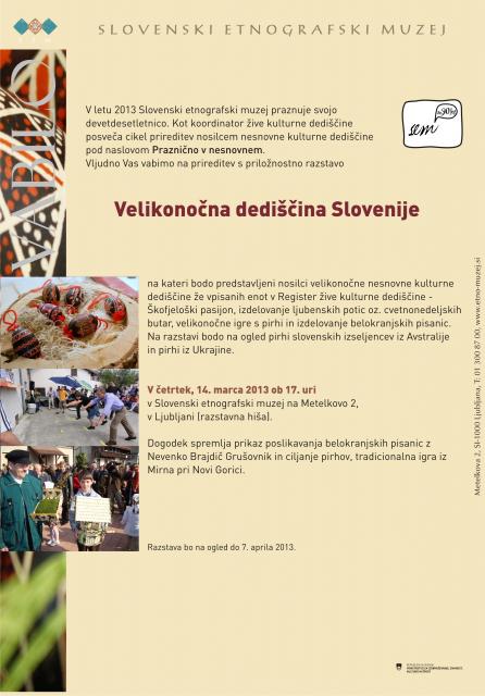 Četrtek, 14. marec 2013, 17:00, odprtje razstave Velikonočna dediščina Slovenije, razstavna hiša SEM