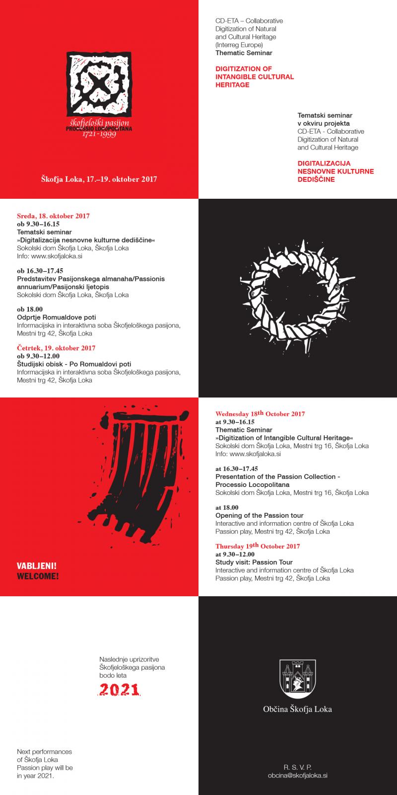 V okviru mednarodnega srečanja projekta CD-ETA (Interreg Europe) vas vljudno vabimo na tematski seminar »Digitalizacija nesnovne kulturne dediščine«, ki bo v sredo, 18. oktobra 2017, z začetkom ob 9.30 v Sokolskem domu (Mestni trg 16-17) v Škofji Loki.