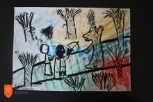 Eva Družinec, Osnovna šola Cvetka Golarja, 4. razred, 10 let - Zgodba o nastanku grba mesta Škofja Loka (drgnjenka- frotaž + tuš).