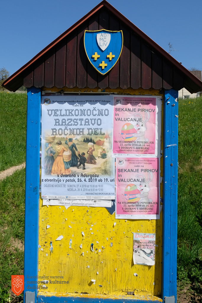 Na velikonočni ponedeljek 22. aprila 2019 sva predstavnici Koordinatorja varstva nesnovne kulturne dediščine Anja Jerin in Nena Židov v Adergasu v tamkajšnji dvorani, namenjeni kulturnim dejavnostim lokalne skupnosti, locirani ob župnijski cerkvi Marijinega oznanjenja, dokumentirali velikonočne igre s pirhi. Dogodek je organiziralo Kulturno umetniško društvo Pod lipo Adergas. Namenjeno je bilo predvsem lokalni skupnosti, udeleženci so bili tako odrasli kot otroci različnih starosti.