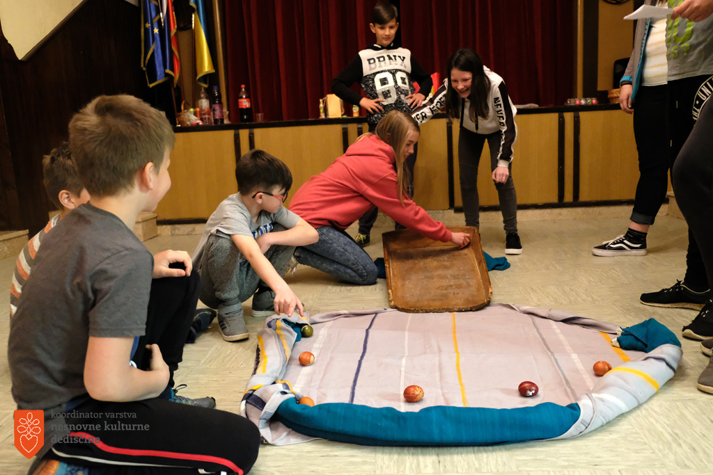 Sprva v dvorani ob cerkvi, kasneje so prizorišče zamenjali za prostor zunaj pred cerkvijo, so skozi popoldne potekale igre s pirhi - »valucanje« pirhov po starih »perivnikih« in »sekanje« pirhov. Število udeležencev teh iger je lahko različno. Pri valucanju pirhov po starih perivnikih je izločen tisti, katerega pirh je zadet s pirhom drugega tekmovalca. Zmagovalec igre sekanja pirhov pa je tisti, ki prvi s kovancem (ponavadi pirhe sekajo s kovanci za 5 tolarjev) preseka pirh. Za zmagovalce je društvo pripravilo tudi sladke nagrade.