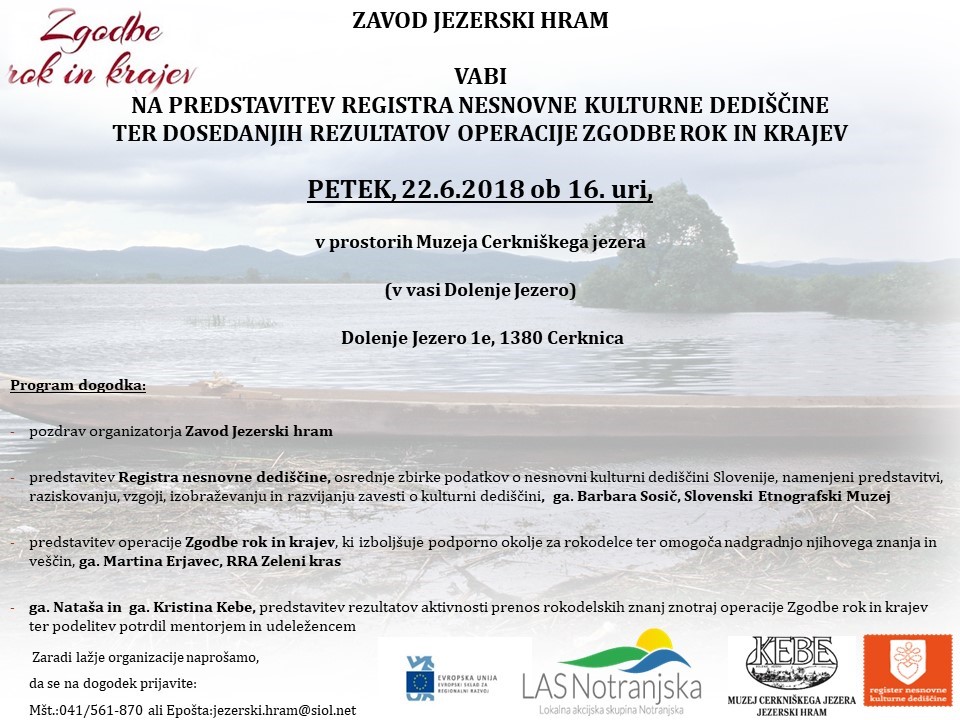 LAS Notranjske in Zavod Jezerski hram sta v petek 22. junija 2018 v prostorih Muzeja Cerkniškega jezera organizirala dogodek v okviru projekta Zgodbe rok in krajev, katerega se je s predstavitvijo Registra nesnovne dediščine in dediščine izdelovanja drevaka, ki je vpisana v Register, udeležila predstavnica Koordinatorja Barbara Sosič. Dogodek, ki se ga je udeležila tudi Martina Erjavec, predstavnica projekta Zgodbe rok in krajev, ki podpira rokodelsko znanje in ga poskuša nadgraditi, je povezovala Kristina Kebe iz Zavoda Jezerski hram, ki je tudi predstavila način, kako prenos obrtniških znanj in veščin poteka v Jezerskem hramu, kjer uspešno organizirajo različne delavnice. Udeležencem delavnic in njihovim mentorjem je podelila diplome.